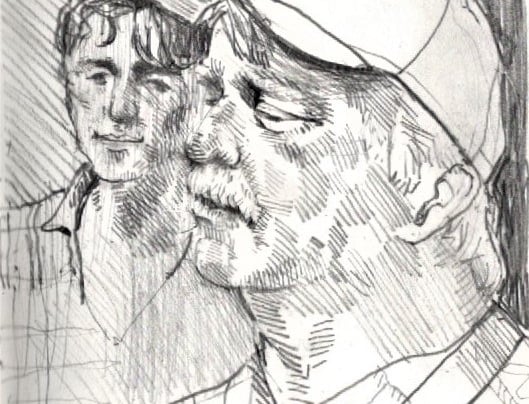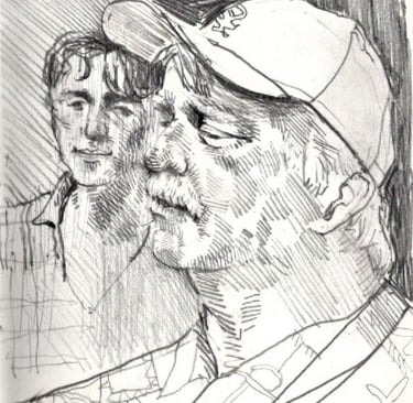 Spike on a train, guitar in hand, staring into space, the wide river shining in the sun.
